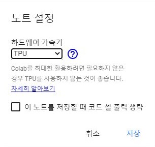 그래서 마지막으로 TPU라고 해서 구글에서만 제공을 하고 있는 특유의 하드웨어를 사용해 보았습니다. 일단 이 경우에는 어떻게 나오는지 보고자 했습니다.