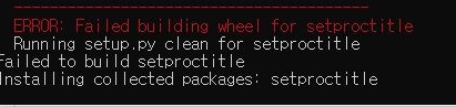 문제는 setproctitle이라는 것 입니다. 이건 제대로 설치가 되지 않고서 계속해서 에러가 나오는 것을 확인할 수 있었습니다. 이게 설치가 된다고 해도 잘 될지 안 될지 모르는 마당이기는 합니다만, 어디서 이런 에러가 나오는 것인지 모르겠습니다만, 아무튼 계속해서 헤메이고 있습니다.
