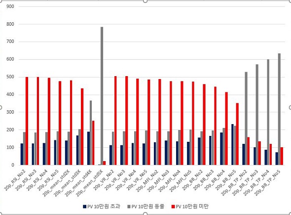 그리고 나서 다음으로 살펴 보아야 하는 것은 바로 PV의 갯수인데, 여기서 짙은 파랑색은 역시나 이익을 본 케이스로 동일 합니다. 결국 이 그래프를 보면, 어느정도 조건이 빡빡하면 할 수 록 이익을 본 포트폴리오 가치를 지니는 종목이 많아 지기는 하고, 손해를 본 종목의 갯수는 줄어드는 경향을 보이기는 합니다.