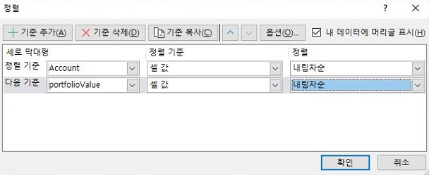 그리고 나서 위 스크린샷과 같은 기준으로 1차 기준은 가장 중요한 계좌 - 즉 지금 당장 인출해서 어떻게 현금화 할 수 있는 현찰이 많은 순으로 정렬을 하고, 그 다음으로는 보유한 주식이 올라서 포트폴리오 가치가 올라간 것을 기준으로 해서 정렬해 보도록 합니다.