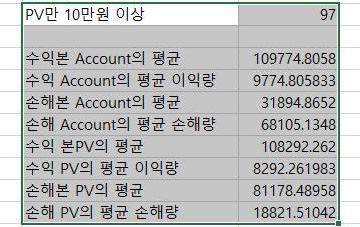 그런데 이것만으로는 부족해서 PV만 10만원 이상 - 즉, 초과라고 해야 하는데, 일단 현금은 적으나, 보유한 주식의 가치가 상당히 증가해서 결과적으로는 수익을 낸 종목의 갯수를 세어보기 위해서는 복수의 조건을 만족하는 countifs 라는 엑셀의 함수를 사용해야 했습니다.