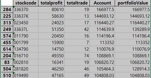 다음으로는 PV상으로만 수익이 나온 종목들입니다. 이 값이 높으면 높을 수록 일단 일정 기간의 알고리즘 트레이딩이 끝난 다음에, 매도를 해야 하는 주식의 양이 많다는 것을 확인할 수 있었습니다. 이렇게 해서 일단 1차적인 테스트의 결과를 일단 분석하는 데는 성공했습니다. 하지만, 남은 데이터가 있어서 이어지는 포스팅에서 나머지를 다루도록 하겠습니다.