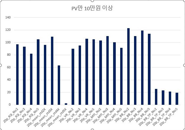 그리고 나서 다음으로 살펴 보아야 하는 것은 바로 PV의 갯수인데, 여기서 짙은 파랑색은 역시나 이익을 본 케이스로 동일 합니다. 결국 이 그래프를 보면, 어느정도 조건이 빡빡하면 할 수 록 이익을 본 포트폴리오 가치를 지니는 종목이 많아 지기는 하고, 손해를 본 종목의 갯수는 줄어드는 경향을 보이기는 합니다.