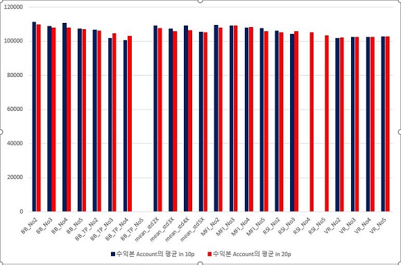 일단은 먼저 Account가 수익을 남기는 쪽으로 끝난 종목만을 모아서, 이 액수들이 얼마나 되는지를 한번 비교해 보았습니다. 다만, 전체적으로는 20period에서 나온 결과가 수익을 덜 보기는 덜 보는 경향이 전체적으로 있어 보입니다.