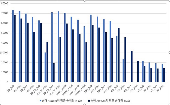 그리고 나서 이번에는 손해본 Account의 마지막 액수를 비교해 보았는데, 일단 여기서는 20period가 손해를 덜 입은 경향이 있어 보입니다.