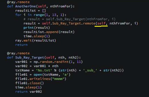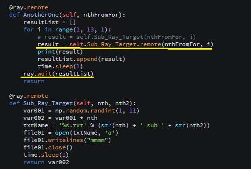 그리고 나서 일단 이 작업을 하기 위해서, 위 스크린샷에서 볼 수 있는 것처럼, 일단 두번째 타겟을 ray의 목표물로 지정을 해 준 다음에, 각자 처리되는 시간이 다를 수 있으니, 여기서는 ray.wait()을 붙여 주도록 합니다.
