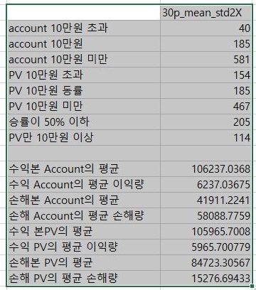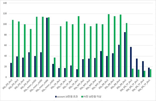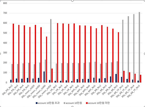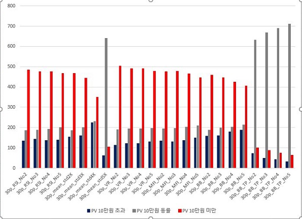 다음으로는 Account가 10만원을 초과한 종목의 갯수와 그 다음에 PV만 10만원 이상으로 올라간 종목의 갯수를 비교하는 그래프를 그렸는데, 이런 그래프 대로라면, 무언가 이동평균선 + 표준편차의 4배수가 가장 나은 결과를 보였다고 할 수 있습니다.