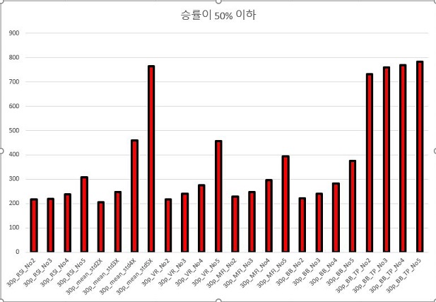 그리고 나서 승률 50% 이하인 종목이 얼마나 되는지를 보았는데, 문제는 Bollinger Band의 TP를 사용하는 경우에 있어서는 무언가 상황이 좋지 않은 것을 확인할 수 있었습니다.