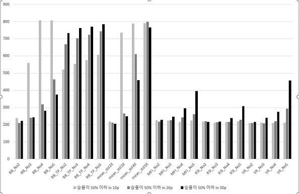 마지막으로 승률이 50% 미만 - 거의 손해만 보는 종목에 대한 갯수를 한번 살펴보니까, 이것에 대한 갯수는 그렇게 특별한 성향이 있는지 확신은 할 수 없습니다. 다만, 이렇게 해서 나온 것을 보면, 일부 보건에서는 30period가 많은 것으로 보여집니다. 그러나 이런 것 보다 더 중요한 것은 이익과 손해의 크기가 아닌가 합니다.
