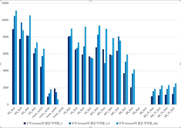 다음으로 봐야 할 것으로는 바로 Account에서 나온 이익량을 한번 각각의 리스크 별로 비교를 해 보았는데, 여기서 일단 리스크가 커지면 커질 수록 수익은 늘어나는 법칙을 발견할 수 있었습니다.