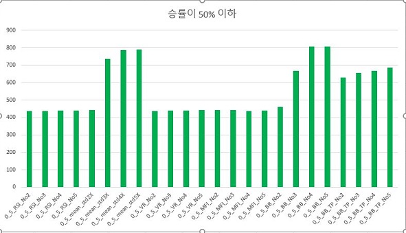 그리고 나서 승률이 50% 이하인 종목의 갯수에 대해서 한번 알아보았는데, 문제는 이렇게 알아보니 거래가 전혀 없어서 아예 0% 승률까지 포함하면, 그렇게 큰 변화는 없어 보입니다.
