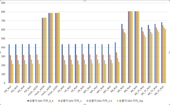 그리고 나서 승률이 50% 이하인 종목의 갯수를 각각의 매수/매도 조건에 따라 비교를 해 보았습니다. 일단 여기서 알 수 있는 것으로는 우선, 몇몇 경우를 제외하고는 리스크가 줄어듦에 따라 이 승률이 50% 이하인 종목의 갯수도 증가하는데, 이게 거래가 없어서 0%인 종목이 증가해서 인게 아닌가 합니다.
