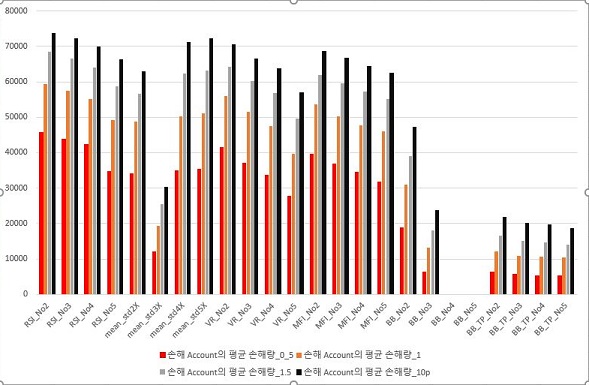 그리고 나서 손해를 본 손해량인데, 일단 여기서는 제 기대대로 리스크가 적어지면 적어질 수록 점점 손해의 크기가 엄청나게 줄어드는 것을 볼 수 있었습니다.