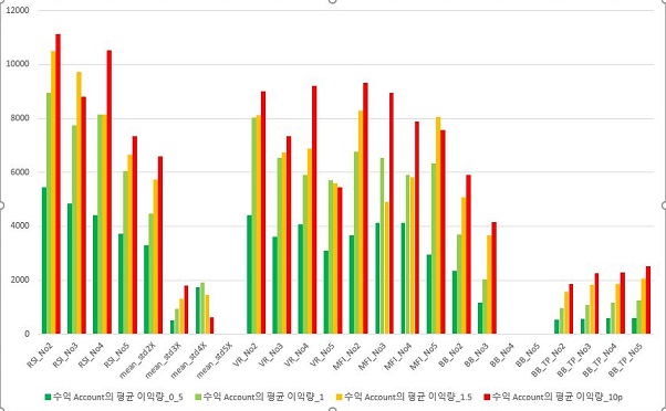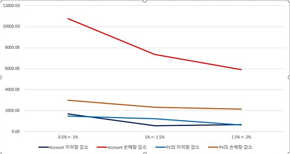 그리고 나서 일단 꺾은선 그래프를 그려보니, 이제 확실히 보이는 경향이, 일단 손해는 PV에서는 미미하게 감소하지만, Account에서는 극적으로 크게 감소를 했고, 이 다음에는 이익이 너무 감소하는 경향을 보여줍니다. 결국 리스크는 1%에서 더는 내리지 않는 것이 좋아 보인다는 결론을 얻었습니다.