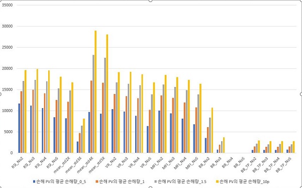 그리고 나서 손해량에 대해서 한번 비교를 해 보았는데 ,여기서는 제 기대대로 리스크가 줄어들면 들수록 점점 더 손해의 크기도 줄어다는 것을 확인할 수 있었습니다.