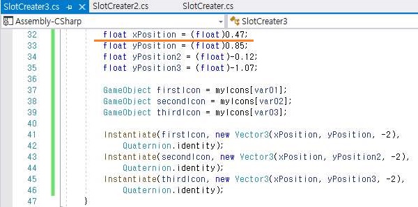 일단 두번째 슬롯에 들어간 스크립트에서는 위 스크린샷에서 볼 수 있는 것처럼 일단 x축의 좌표를 다르게 바꾸어 주도록 합니다.