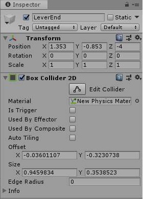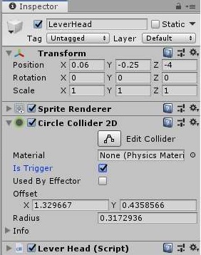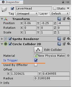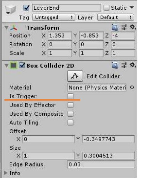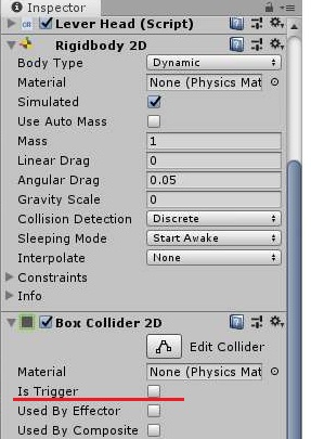 그리고 나서 다음으로 레버가 움직이는 레버 헤드 마져도 is Trigger를 해제하도록 했습니다. 이렇게 왜 했느냐 하면, 바로 이렇게 해야 다음 스크린샷과 같이 일단 충돌을 인식할 수 있게 되는 것 입니다.