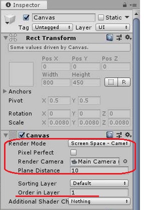 다음으로 진행하려고 하는 것은 먼저 캔버스를 스크린 스페이스로 해서 놔둔 다음에, 메인 카메라를 타겟으로 놓는 것은 좋습니다만, 문제는 Order in Layer를 1로 놔두는 것을 했는데, 이렇게 하면 전체적인 캔버스의 위치를 지정할 수 있게 되는 것 입니다.