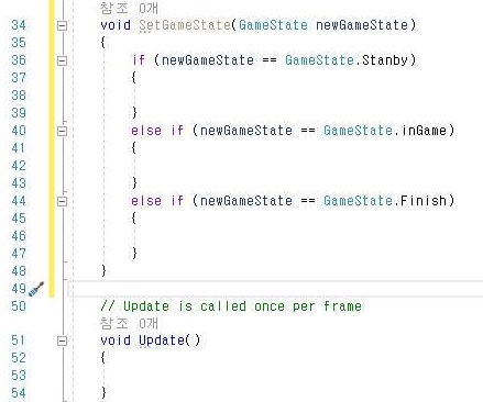 먼저 시작시 가장 먼저 첫 프레임이 시작되기 전에 호출이 되는 Start()메서드 앞에서 일단 게임의 진행상태랄까 3가지 상태로 구분해서 무얼 만들기 위해서 메서드를 3개 만들어 줍니다.