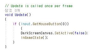 먼저 해야 하는 것으로는 바로 게임 상태를 이제 버튼을 한번 눌렀으면, 화면을 어둡게 만드는 스크린을 걷어내는 작업을 SetActive()라는 함수를 이용해서 불활성화 시켜 주는 것으로 했습니다.
