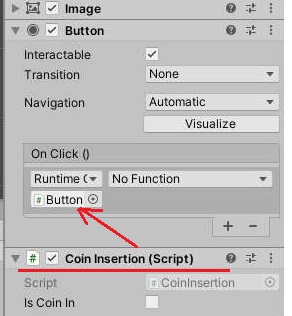 그리고 나서 위 스크린샷에서 볼 수 있는 것처럼, 일단 스크립트를 버튼을 눌렀을 경우 발생하는 이벤트에 목표 오브젝트로 집어 넣어 주도록 합니다. 이렇게 해서 버튼을 만드는 1차 과정은 끝이 났습니다. 다만 이런다고 완성이 되는 것이 아니라 다음 포스팅에서 이어서 작업을 해 주도록 하겠습니다.