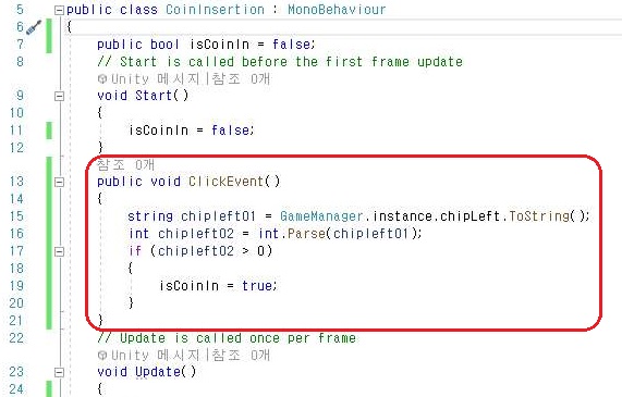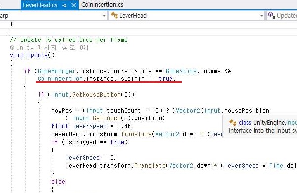 그리고 나서 이렇게 코인이 들어갔다 = 칩이 들어간 상황에서만 레버 헤드가 내려갈 수 있도록 if문을 고쳐 주도록 합니다. 이렇게 해 주는 것으로 이제 준비는 된 듯 합니다.