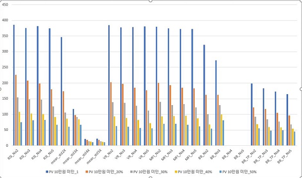 그리고 나서 다음으로 알아보고자 해서 그려놓은 그래프는 바로 PV - 포트폴리오 가치를 측정한 결과, 수익이 난 종목의 갯수인데, 이 수치역시 그래프를보면 전체적으로 50%의 손절매 조건에서는 감소하는 것을 확인할 수 있습니다.