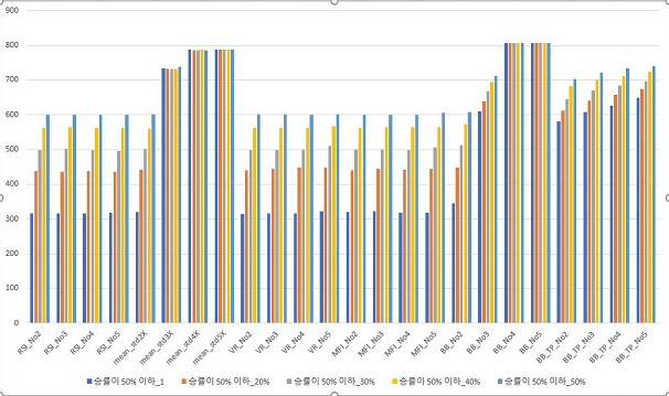 그리고 나서 거래 자체가 없는 종목의 갯수가 늘어난 탓인지 모르겠습니다만, 일단 위 스클니샷을 보시면 승률이 50%이하인 종목의 갯수도 점점 %가 늘어남에 따라 증가하는 것을 확인할 수 있습니다.