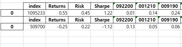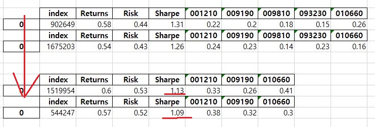 그런데 위쪽에 해당하는 이익 최대의 조건에서, 0이라는 비중을 받은 종목이 3개 보입니다. 이 종목은 당연히 빼야 하는 것이고, 나머지 비중이 정말 작은 종목도 제거하도록 합니다.