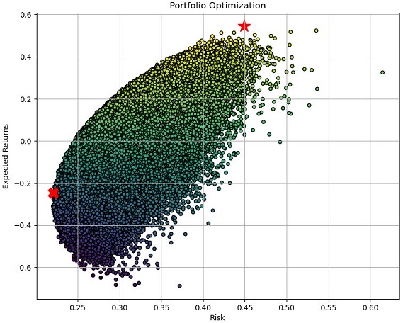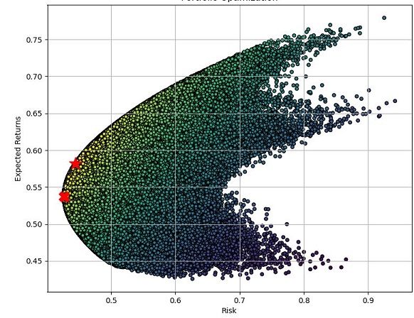무언가 그래프의 보양이 더 기묘하게 변했다는 생각이 듭니다만, 아무튼 더 확실하게 선이 생성이 되었고, 이제 이 효율적 투자선에서 어떤 결과가 나왔는지 보도록 하겠습니다.