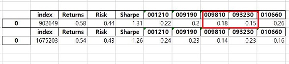 일렇게 해서 나온 결과에도 위 스크린샷에서 볼 수 있는 것처럼 일단 비중이 가장 작은 종목이 2개 나오는 것을 확인할 수 있기는 있었습니다. 다만, 이 종목들이 비중이 작다고 이야기 하기에는 문제가 있기는 있었습니다.