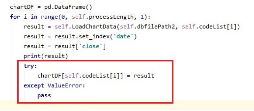 그래서 이래저래 시도가 안 되어서 이번에는 궁여지책으로 일단 try와 except구문을 한번 써 보도록 했습니다. 이렇게 하면 일단 에러는 피해갈 수 있었습니다.