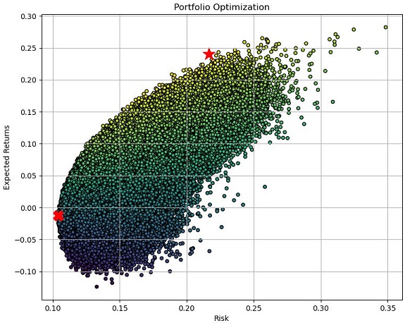 그리고 나서 다음으로 제대로 나오는 이 효율적 투자선 결과가 제대로 나왔느냐 하면, 일단 결과 자체는 제대로 나오는 것을 확인할 수 있기는 있었습니다.
