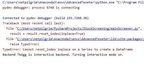 디버그 모드로 한번 돌려본 결과는 위 스크린샷과 같이 일단 여기서는 시리즈를 데이터 프레임으로 돌리는 과정에서 인덱스를 리셋할 수 없다는 식으로 에러가 나옵니다.