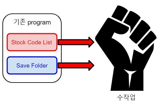 일단 기존의 작업이 어디가 문제였느냐 하면, 종목 코드 리스트랑 저장을 해야 할 폴더를 일일히 지정해야 하는 문제점이 있었습니다. 이걸 2분 간격으로 계속 한다고 해도 60회 이상가면, 이건 이거대로 좀 할짓이 아니기는 합니다.