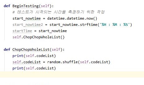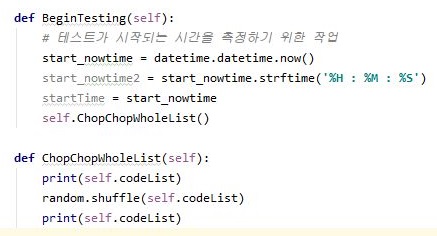 그리고 나서 여기다가 하나하나 일단 메서드를 만들어 주도록 합니다. 일단 여기서는 위 스크린샷처럼 자르는 메서드라는 이름의 메서드에서 random.shuffle이라는 것을 넣어저 리스트의 구성요소를 섞어서 랜덤하게 배열해 주도록 합니다.