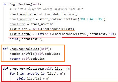 그리고 나서 어떻게 하면 리스트형 자료를 조각조각 낼 수 있느냐 했더니, 여기서 이제 힌트가 있었습니다. for loop에 yield구문을 쓰는 것으로 해결을 할 수 있었습니다만, 문제가 하나 있습니다. 바로 이걸 사용할 때는 빨간색 박스안에 들어가 있는 내용처럼 아예 독립적인 메서드로 만드는 편이 메서드가 실행되지 않는 에러를 피할 수 있었습니다.