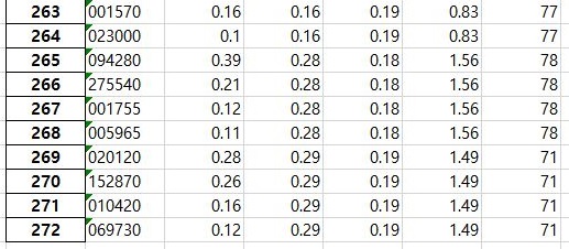 그리고 나서 다음으로 해야 하는 일로는 위 슨크린샷에서 볼 수 있는 것처럼 일단 260개라고 상대적으로 적은 갯수의 종목이 필터링을 통과한 것을 확인할 수 있었습니다.