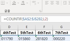 이렇게 해서 다음으로는 일치하는 종목의 갯수를 구하는 것이 문제라면 문제인데, 이 경우에는 아래의 스크린샷과 같이 일종의 countif함수를 사용했습니다.
