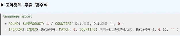 그리고 나서 다음으로 진행하고자 하는 것은, 바로 위 스크린샷에서 볼 수 있는 것과 같이 일ㄷ나, 고유항목의 갯수와 그 항목자체를 추출할 수 있도록 하는 엑셀의 함수를 가지고 오도록 하는 것 입니다.