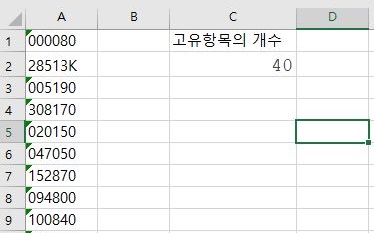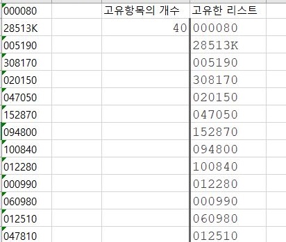 그리고 나서 상당히 복잡한 이 고유항목을 추출할 수 있는 엑셀 함수를 사용한 다음에, 위 스크린샷처럼 고유항목 40개를 추출해 보도록 합니다.