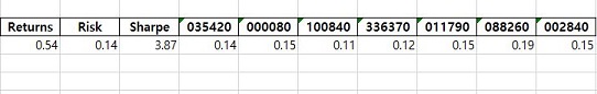 우선 무언가 상어 등 지느러미와 같은 모양이 되었지만, 아무튼 이렇게 하서 나온 결과를 보면, 거의 최소 리스크나 최대 샤프지수의 내용이나 그게 그것인 것을 확인할 수 있었습니다.