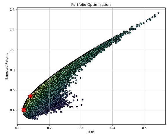 위 스크린샷에서 볼 수 있는 것처럼 다시한번 포트폴리오 이론을 바탕으로 해서 효율적 투자선을 만들어 보고자 합니다. 이렇게 하는 것으로 이제 작업을 하면..........