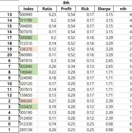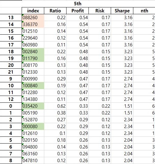 각각의 효율적 투자선을 구축한 조건을 가지고서 한번 테스트에 들어가 보도록 해야 겠습니다. 일단 이 조건에서는 우선 각각의 종목에 맞는 번호의 셀을 서식 바꾸기를 해 줍니다.