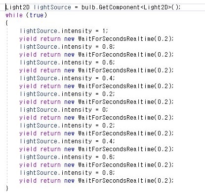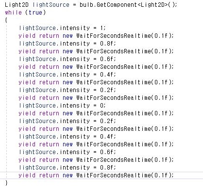 그렇게 해서 어떻게 다음으로 했느냐 하면, 소수점의 광원 intensity와 시간을 동원해서 좀 부드럽게 하나하나 무언가 빛의 세기가 줄어들다가 커지도록 했습니다.