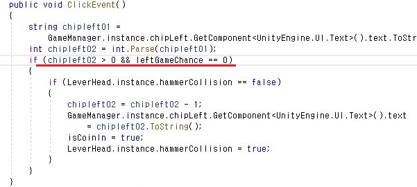 이렇게 해서 기존에는 칩의 갯수가 0을 넘기만 하면 누를 수 있었던 투입구가 이제는 남은 게임 횟수가 0일 경우에만 누를 수 있는 것으로 바꾸어 주도록 합니다.