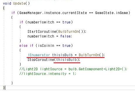 그래서 먼저 코인이 들어온 상태가 되면 Stop코루틴이라는 명령어를 써서 한번 멈추어 보고자 했습니다. 일단 이렇게 해서 작업이 되었는가 하면........