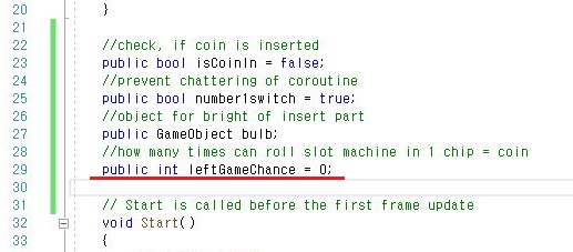 이렇게 해서 기존에는 칩의 갯수가 0을 넘기만 하면 누를 수 있었던 투입구가 이제는 남은 게임 횟수가 0일 경우에만 누를 수 있는 것으로 바꾸어 주도록 합니다.
