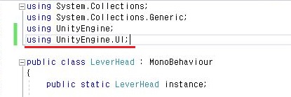 그리고 나서 다음으로 시행을 한 것으로 위 스크린샷처럼 일단 UI오브젝트를 손보기 위해서는 먼저 using UnityEngine.UI라고 첫머리에 붙여 놓아야 합니다.