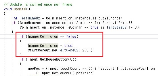 그리고 나서 채터링을 방지하기 위해서 만들었다고 하지만, 일단 쓰이지 않아 보이는 이 hammerCollision이라는 변수를 사용해서 일단 코루틴을 작동 시키기 위한 작업을 하도록 합니다.
